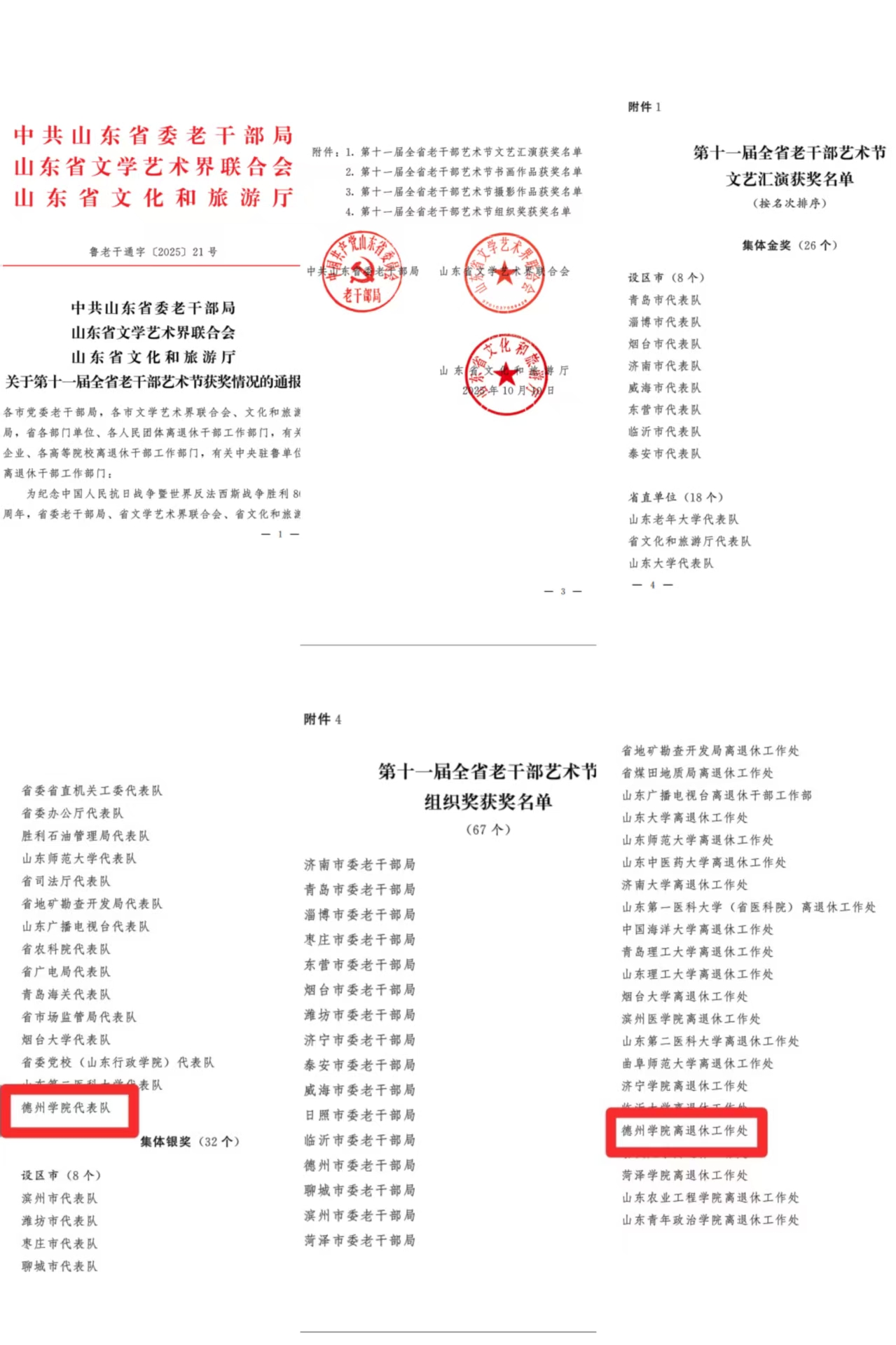 为纪念中国人民抗日战争暨世界反法西斯战争胜利80 周年,山东省委老干部局、省文学艺术界联合会、省文化和旅游厅联合主办了第十一届省老干部艺术节。全省各级老干部工作部门共报送文艺节目75个,BBIN宝盈集团官方参演曲目《歌唱英雄常大娘》荣获金奖,德州学院BBIN宝盈集团官方获得组织奖。