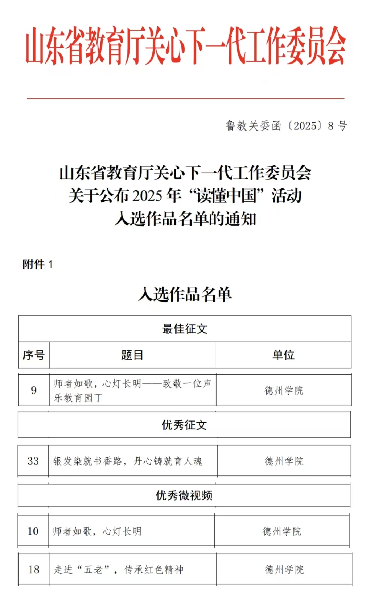 近日,山东省教育厅关心下一代工作委员会公布了2025年“读懂中国”活动入选作品名单。BBIN宝盈集团官方在此次活动中表现突出,荣获多项省级奖项,同时获评“2025年‘读懂中国’活动表扬单位”,充分展现了我BBIN宝盈集团官方工作的扎实成效和育人工作的丰硕成果。
